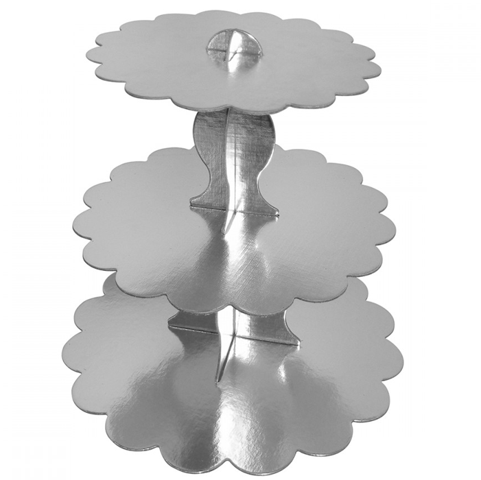 Metalik Gümüş Cupcake Standı 3 Katlı bebek, çocuk ve yetişkin doğum günleri, yılbaşı sofrası, şeker büfesi, sevgililer günü kutlamaları ve cupcake sunumları için dayanıklı karton stand. 39.3cm x 29.8cm ebatındadır. 3 katlı, baskılı kek standı ile yaptığınız muffinleri, temalı cupcake’leri, muffinleri, kekleri ve kurabiyeleri hem pratik, hem de şık bir şekilde misafirlerinize sunabilirsiniz.