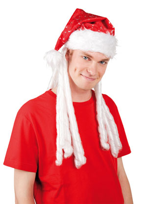 Noel Baba Şapkası Saçlı alnı elyaf bantlı ve uzun rasta elyaf saçlı altın yıldız baskılı ince kadife yılbaşı şapkası. Noel Baba olmanın şartı Noel baba şapkası takmakta! Beyaz ve uzun sentetik saçlı, kaliteli yılbaşı şapkası. Yetişkinler için üretilmiştir. Yılbaşı partileri için ideal kostüm aksesuarıdır.